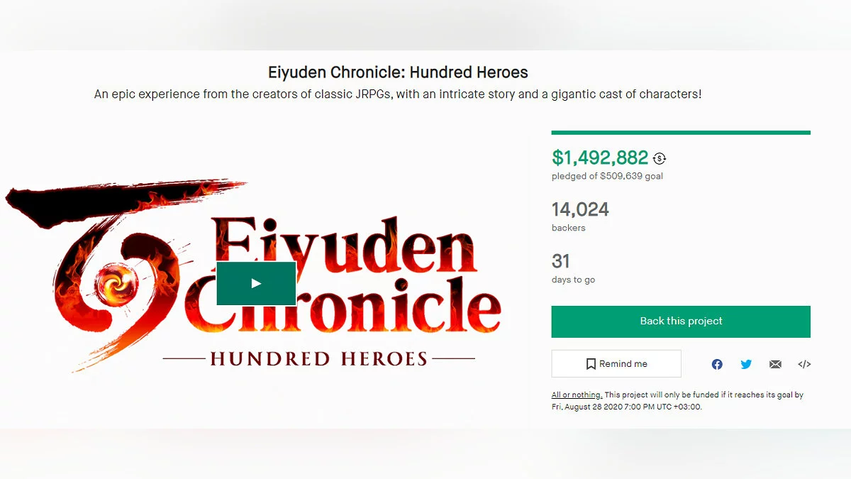 Вчера на краудфандинговой площадке Kickstarter стартовала кампания по сбору средств на разработку японской ролевой игры Eiyuden Chronicle: Hundred Heroes, которой удалось собрать нужную сумму ($509 тыс) всего за несколько часов. За день же проект получил $1,492 млн (около 107 млн рублей).