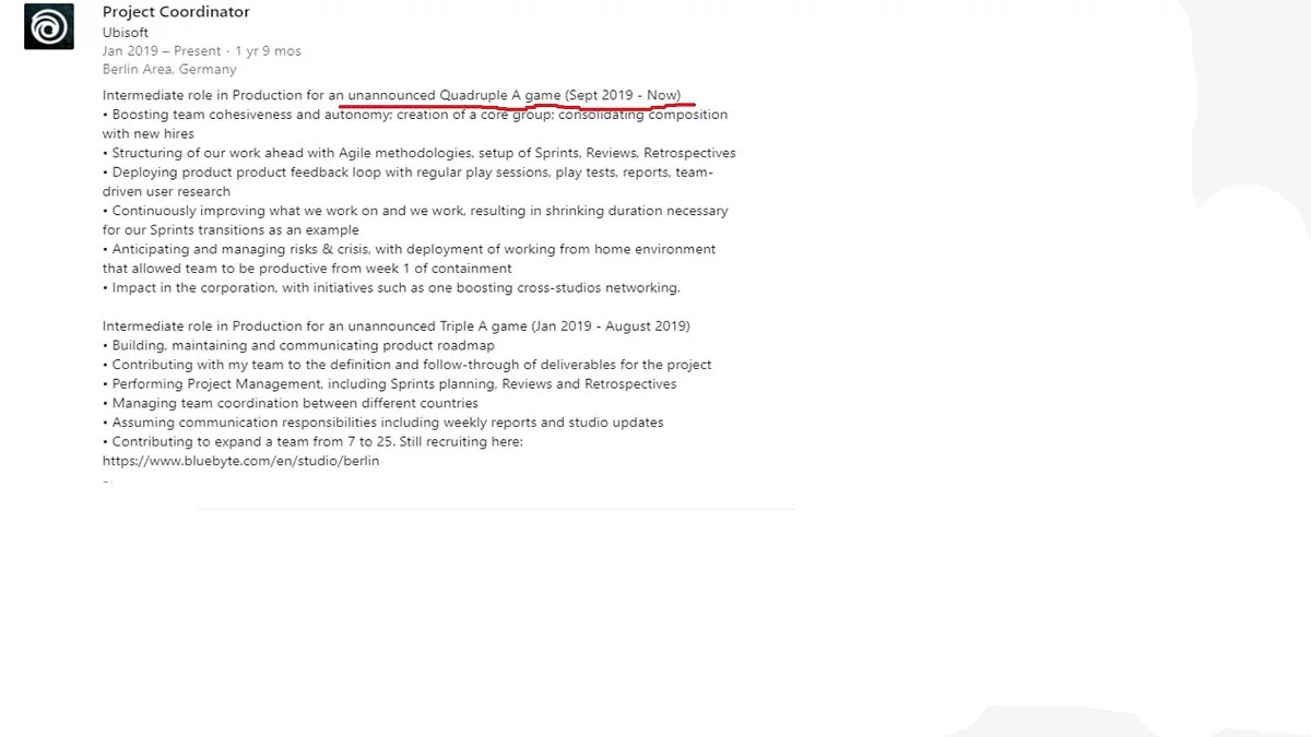 На данный момент Ubisoft работает над несколькими играми AAAA-класса. Об этом стало известно благодаря страницам разработчиков на сайте LinkedIn, обнаруженным пользователем Twitter @bogorad222.