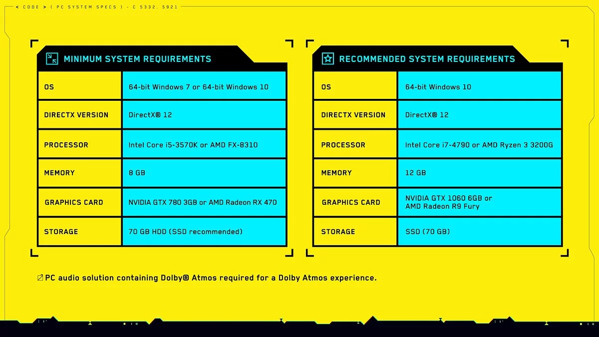 Они оказались не такими уж и злыми, как ожидали фанаты: компьютер должен иметь хотя бы процессор Intel Core i5-3570K и видеокарту уровня NVIDIA GTX 780. Даже при самых высоких настройках игра не будет требовать больше 12 ГБ оперативной памяти.