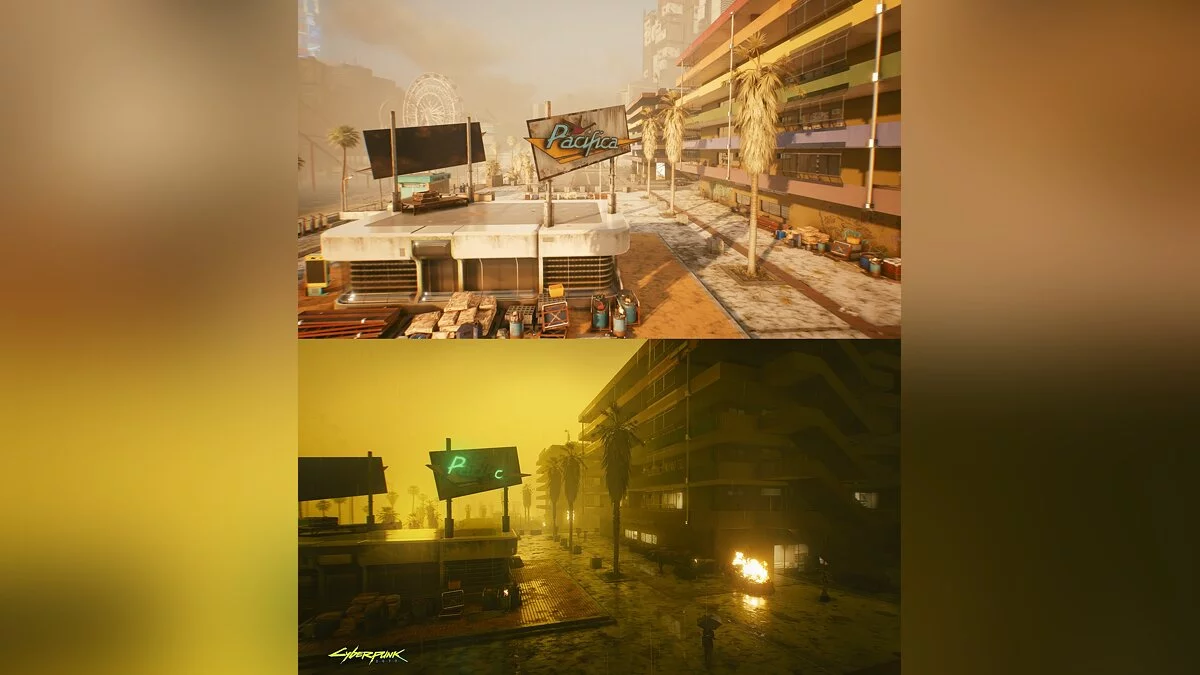 Одно и то же место в Cyberpunk 2077 показали при разной погоде. Уже в топах Reddit
