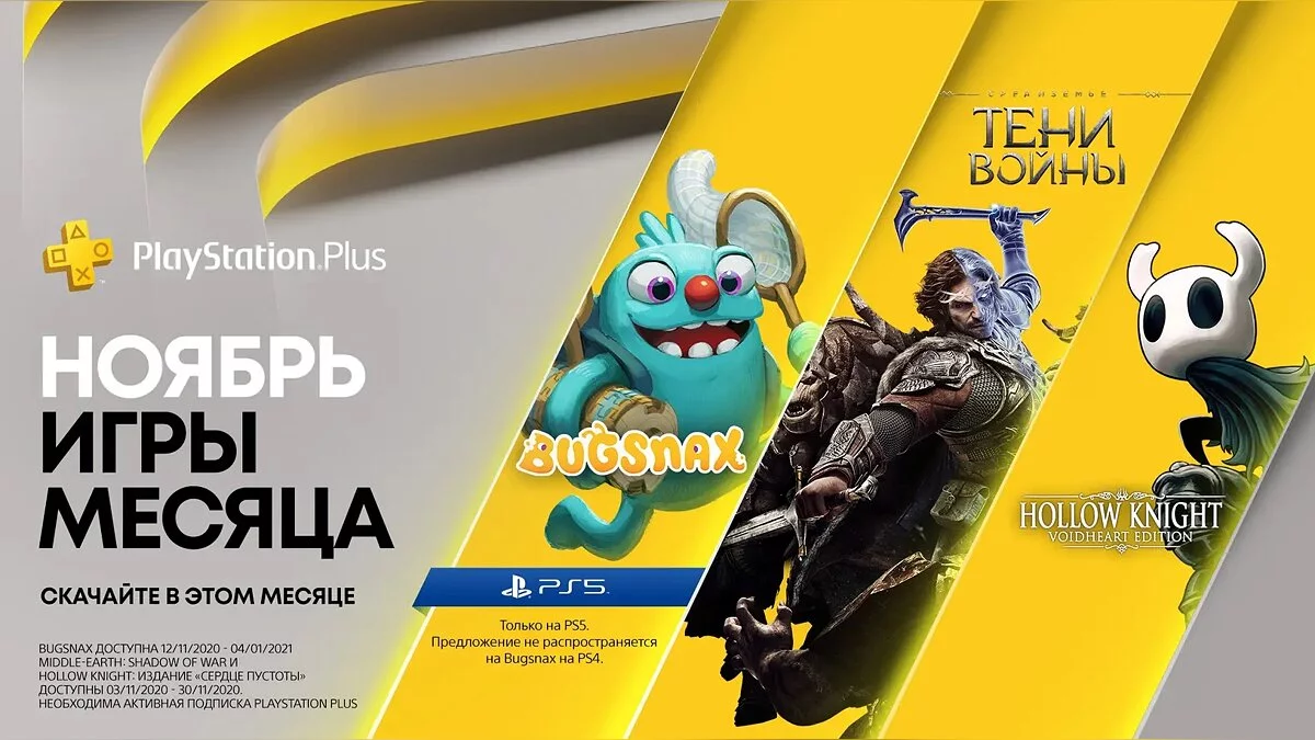 Sony только что объявила ноябрьскую линейку игр PS Plus. В следующем месяце подписчики сервиса бесплатно получат Middle-earth: Shadow of War и Hollow Knight: Voidheart Edition для PlayStation 4, а также первый тайтл для PlayStation 5 — адвенчуру Bugsnax.