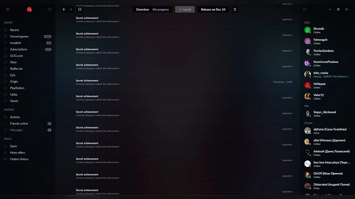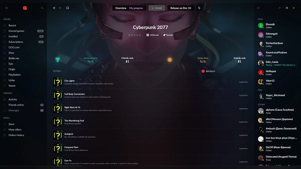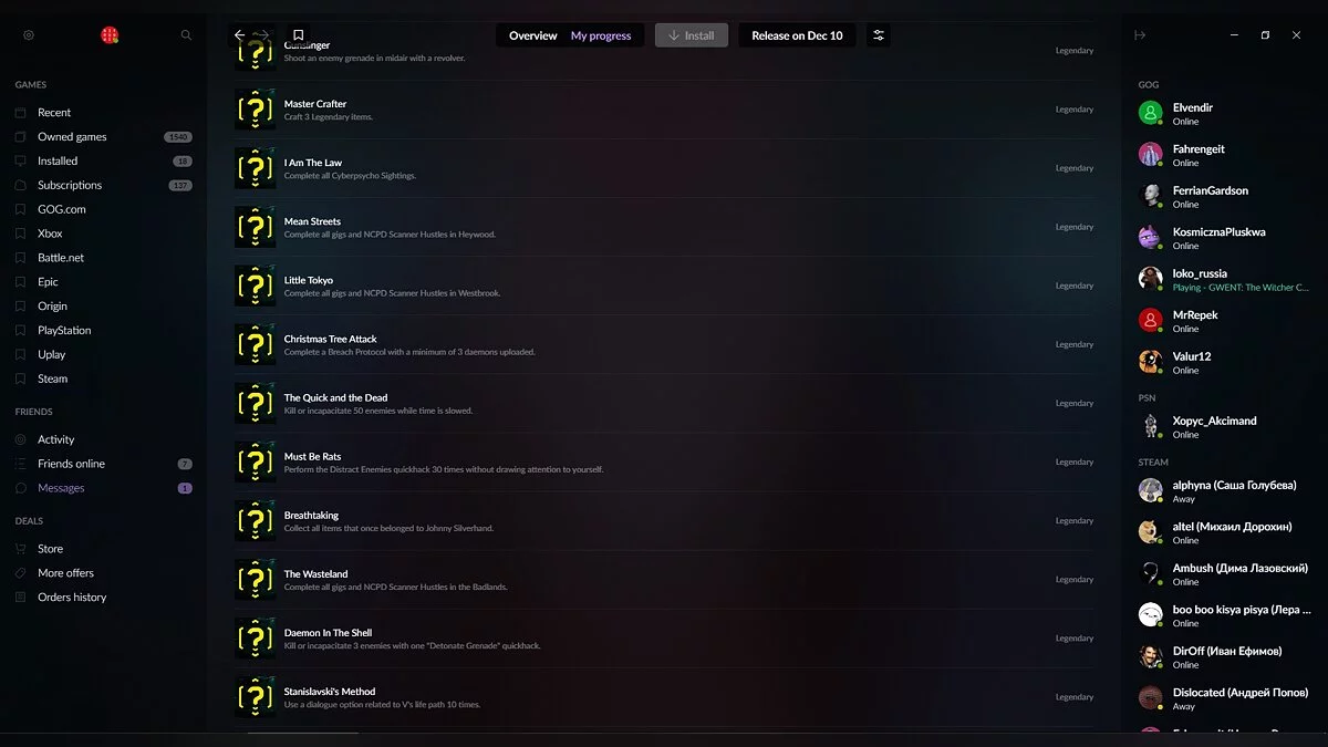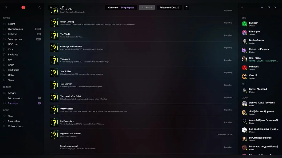 До релиза Cyberpunk 2077 остался еще месяц, однако в сети уже появился список всех трофеев. Достижения были обнаружены в лончере GOG GALAXY 2.0 одним из российских пользователей.