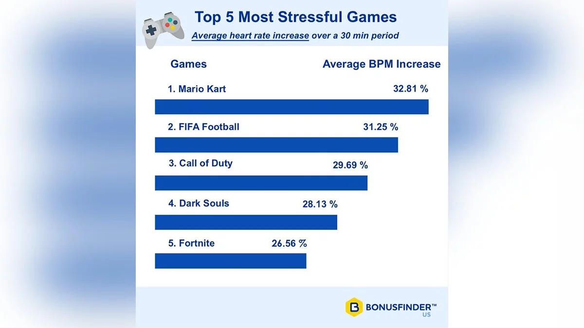 Когда вы думаете о подобных видеоиграх, последнее, что приходит на ум, это Mario Kart 8. Однако именно её специалисты определили в качестве самой «стрессовой» игру на сегодняшний день. Команда проекта BonusFinder провела ряд тестов, предлагая геймерам 16 самых популярных компьютерных, консольных и мобильных игр. При этом замерялась частота пульса.
