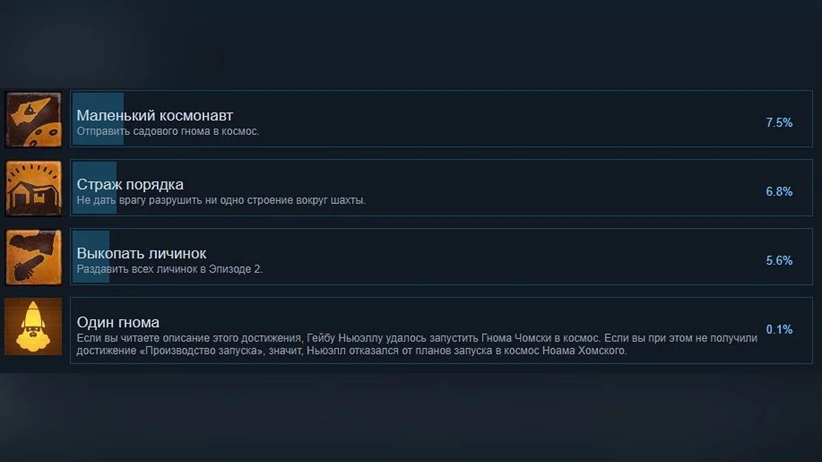Описание достижения под названием «Один гнома» гласит: «Если вы читаете описание этого достижения, Гейбу Ньюэллу удалось запустить Гнома Чомски в космос. Если вы при этом не получили достижение “Производство запуска”, значит, Ньюэлл отказался от планов запуска в космос Ноама Хомского».