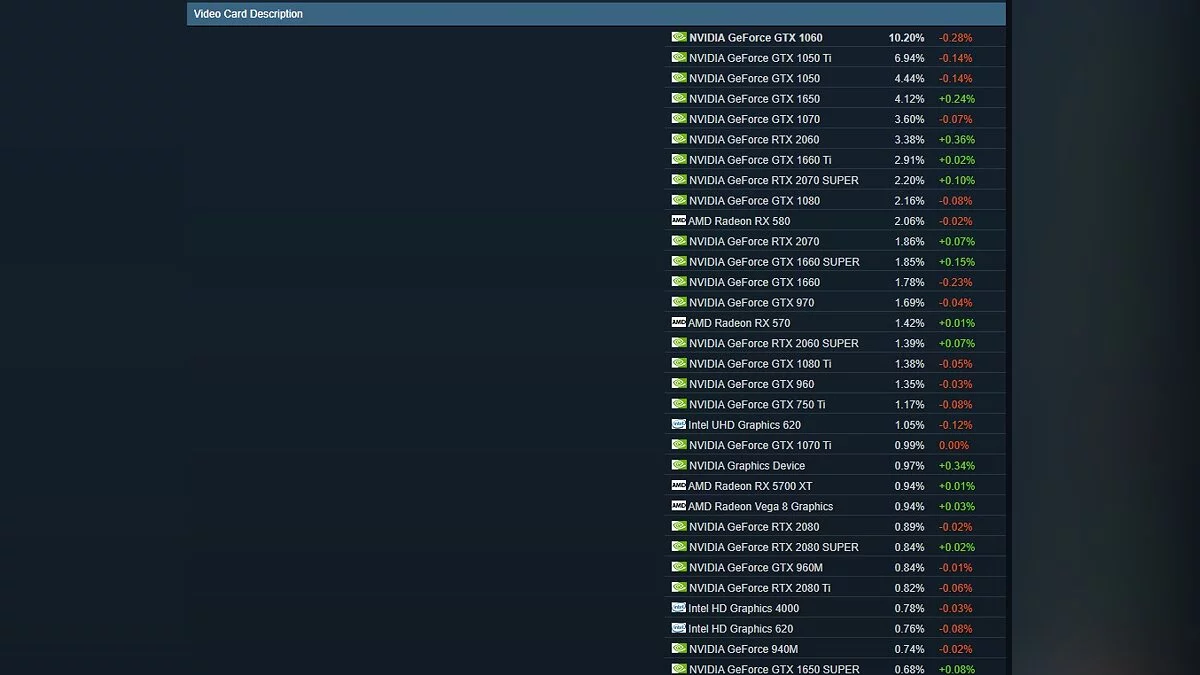 Звание самой народной видеокарты до сих пор сохраняет NVIDIA GTX 1060: в прошлом месяце ее доля составила 10,20%. На втором месте находится GeForce GTX 1050 Ti (6,94%), тройку замыкает GeForce GTX 1050 (4,44%). Интересно, что все указанные видеокарты постепенно теряют популярность, в то время как GTX 1650, RTX 2060 и GTX 1660 Ti становятся все более распространенными.