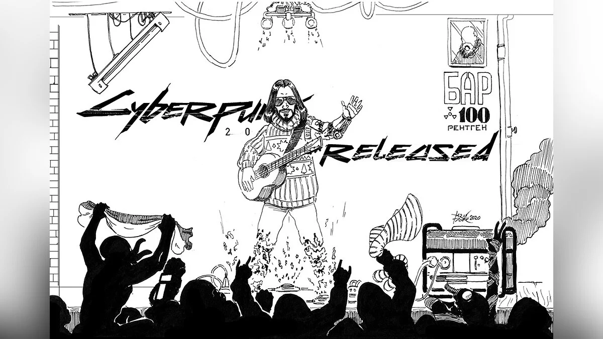 Джонни Сильверхенд по-прежнему собирает залы, но уже уже в баре «100 Рентген». Подпись к посту гласит: «Cyberpunk 2077 наконец-то здесь! Поздравляем CD Projekt RED с долгожданным релизом