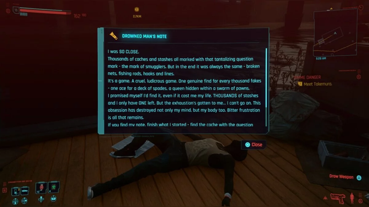 В этом месте лежит мертвец с любопытной запиской. В ней говорится, что мужчина вскрыл уже «тысячу тайников, отмеченными знаками вопроса». Те, кто играл в The Witcher 3, вспомнят многочисленные схроны с контрабандой, которые обычно находятся в воде.