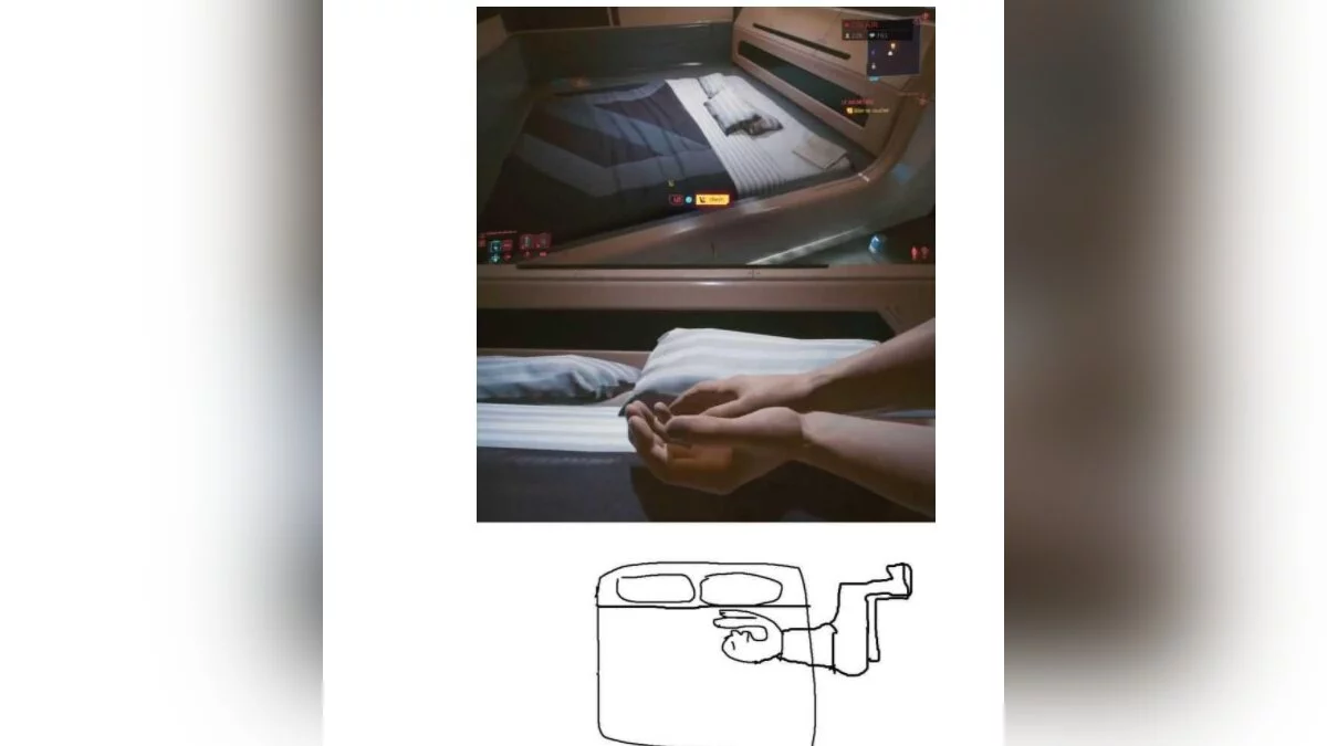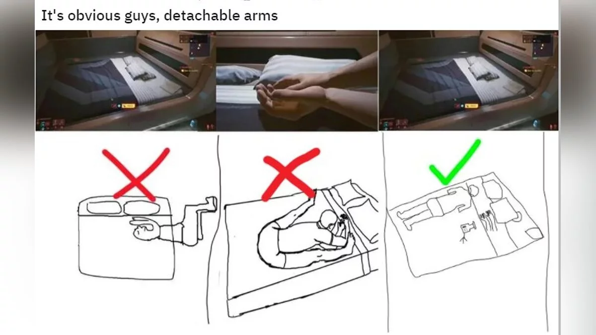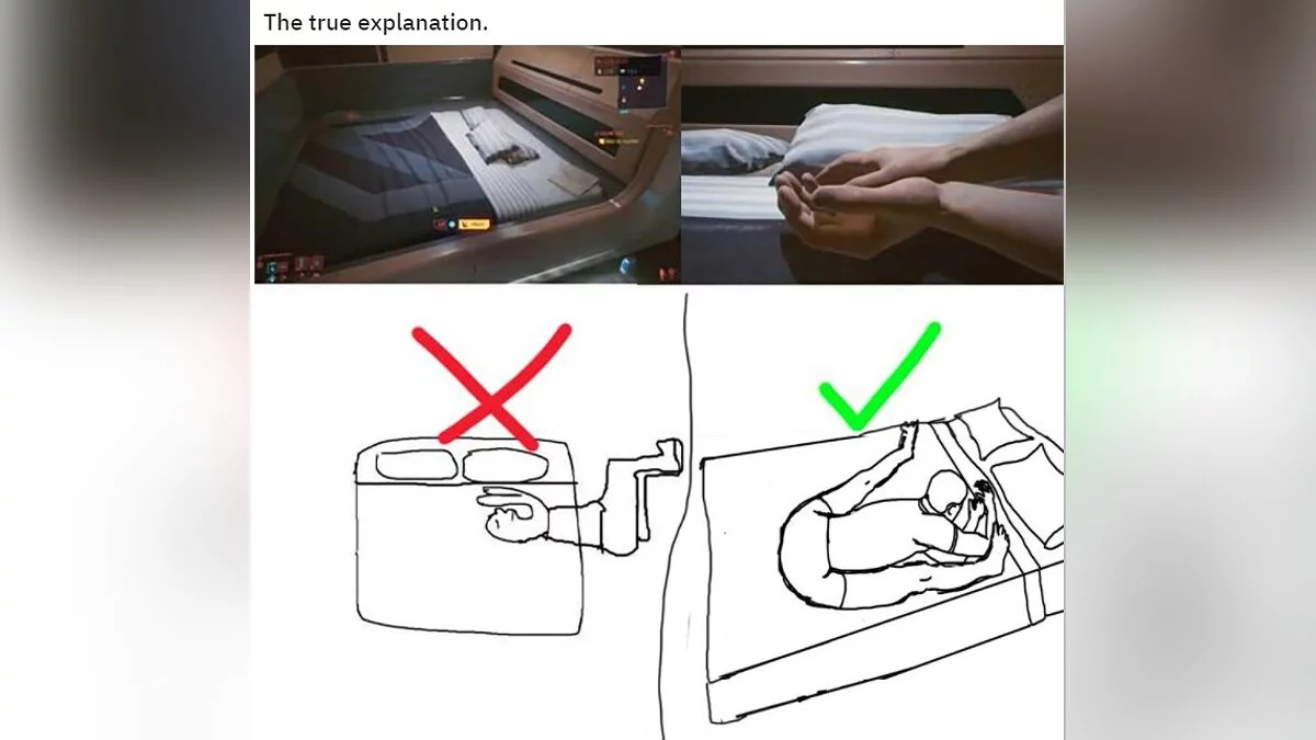 На Reddit множатся теории, которые пытаются объяснить это с точки зрения человеческой анатомии. Ведь, если внимательно изучить скриншот, то становится ясно, что главный герой лежит на кровати лишь наполовину, а ноги свисают на пол.