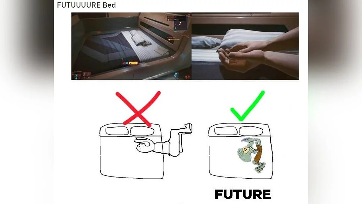 После долгого дня, проведенного в Найт-Сити, очень хочется упасть в кровать и заснуть. Однако, судя по некоторым моментам, Ви уж слишком утомился. Иначе не получается объяснить, почему он спит в такой странной позе.