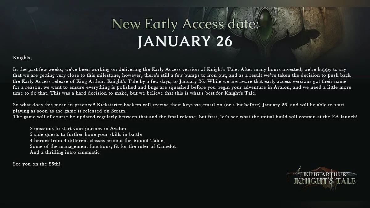 Последние несколько недель мы работали над выпуском игры в раннем доступе. Было потрачено много часов, и теперь мы рады сообщить, что очень близки к запуску. Тем не менее, нам еще предстоит сгладить некоторые шероховатости, поэтому мы решили отложить релиз King Arthur: Knight's Tale на несколько дней, до 26 января. Мы знаем, что ранний доступ называется так по вполне конкретным причинам, но мы хотим убедиться, что все будет отполировано, прежде чем вы начнете свое приключение в Авалоне. Это было трудное решение, но мы считаем, что игре это пойдет на пользу.