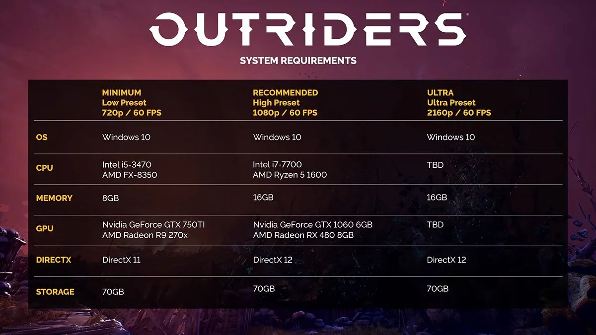 Требования к минимально допустимой конфигурации, которая позволит запустить Outriders в 720p, и того ниже. Геймерам понадобится процессор Intel Core i5-3470/AMD FX-8350, 8 ГБ оперативной памяти и видеокарта класса GTX 750TI или Radeon R9 270X. Square Enix подчеркивает, что игрокам понадобится как минимум 70 ГБ свободного пространства на винчестере. Outriders будет поддерживать DirectX 11 и 12.