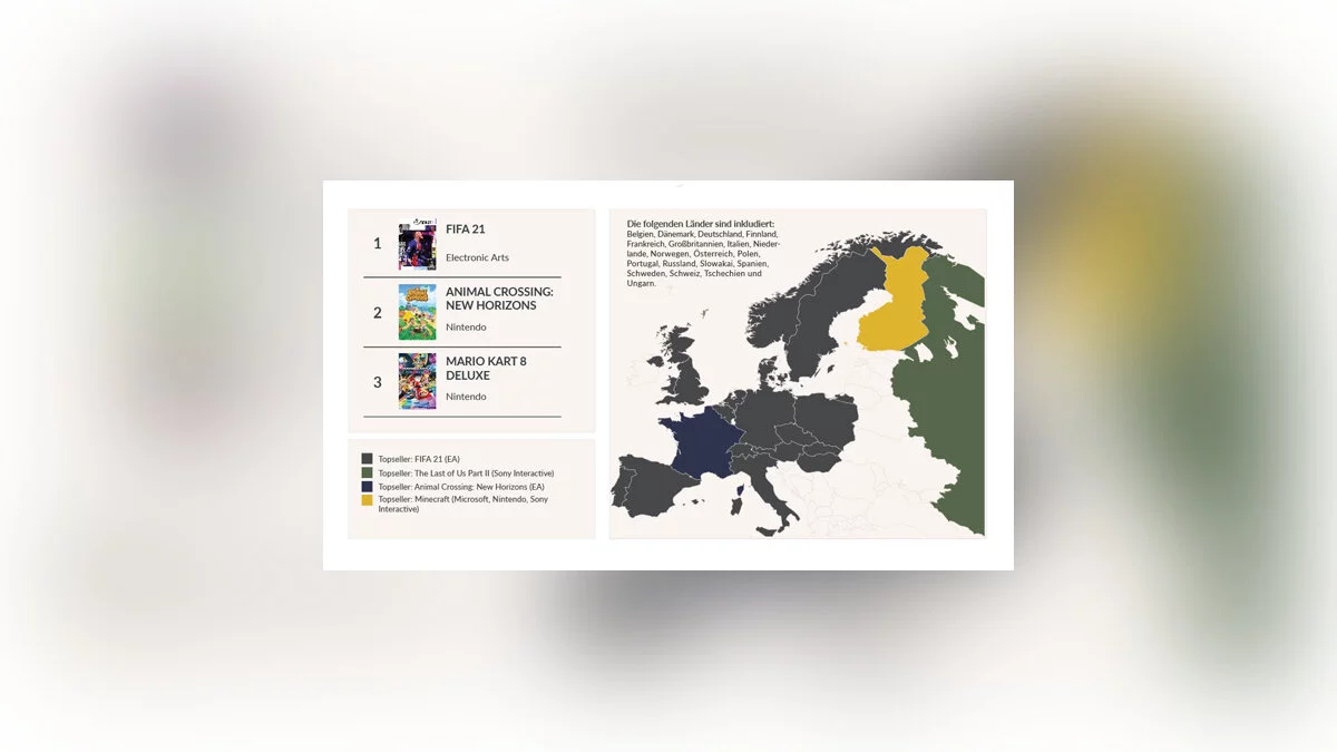 Во Франции самой продаваемой игрой стала Animal Crossing: New Horizons, а в Финляндии — Minecraft. Другой хит, GTA 5, по-прежнему пользуется большой популярностью: особенно игру ценят в странах Восточной Европы, таких как Польша, Россия, Чехия и Венгрия, а также в Дании и Португалии.