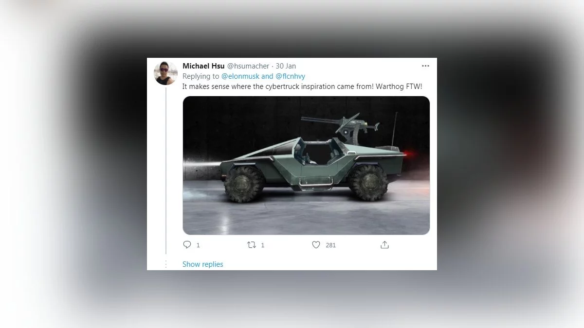 Волна комментариев накрыла пост, в котором Илон Маск высказался о Cyberpunk 2077. Глава компании Tesla назвал единственную консольную игру — Halo. Сам факт того, что миллиардер ответил на вопрос подписчицы взбудоражил фанатов, среди комментариев стали появляться даже ответы разработчиков игры. Некоторые пользователи отметили внешнее сходство между бронетранспортером «Вепрь» из шутера и электромобилем Cybertruck от Tesla. «Теперь ясно, откуда пришла идея дизайна Cybertruck!» — пишет один из фанатов. Кто знает, может, когда-нибудь мы увидим «Пеликана» или «Фрегат» в исполнении SpaceX.