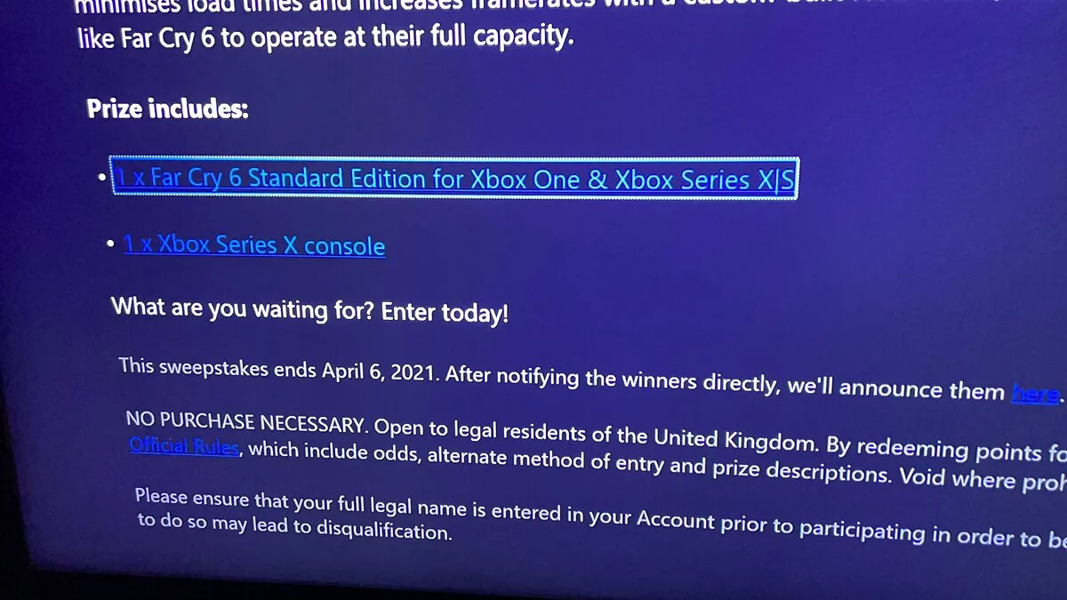 Дело в том, что американская корпорация проводит розыгрыш, призом в котором выступает консоль Xbox Series X и цифровая копия Far Cry 6. При этом датой окончания мероприятия значится 6 апреля 2021 года, о чем свидетельствуют вот эти скриншоты.