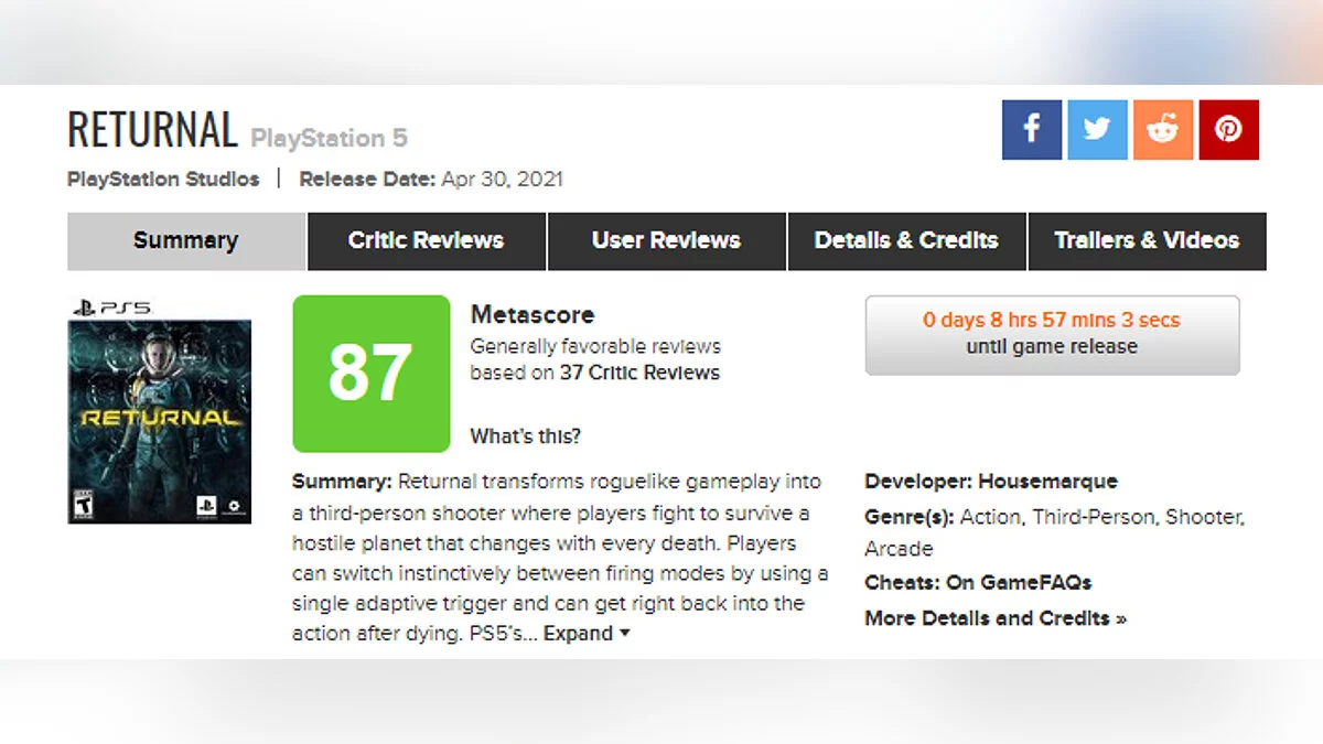 На момент написания новости общая оценка Returnal составляет 87 баллов.