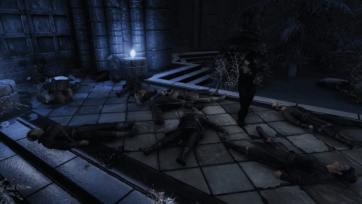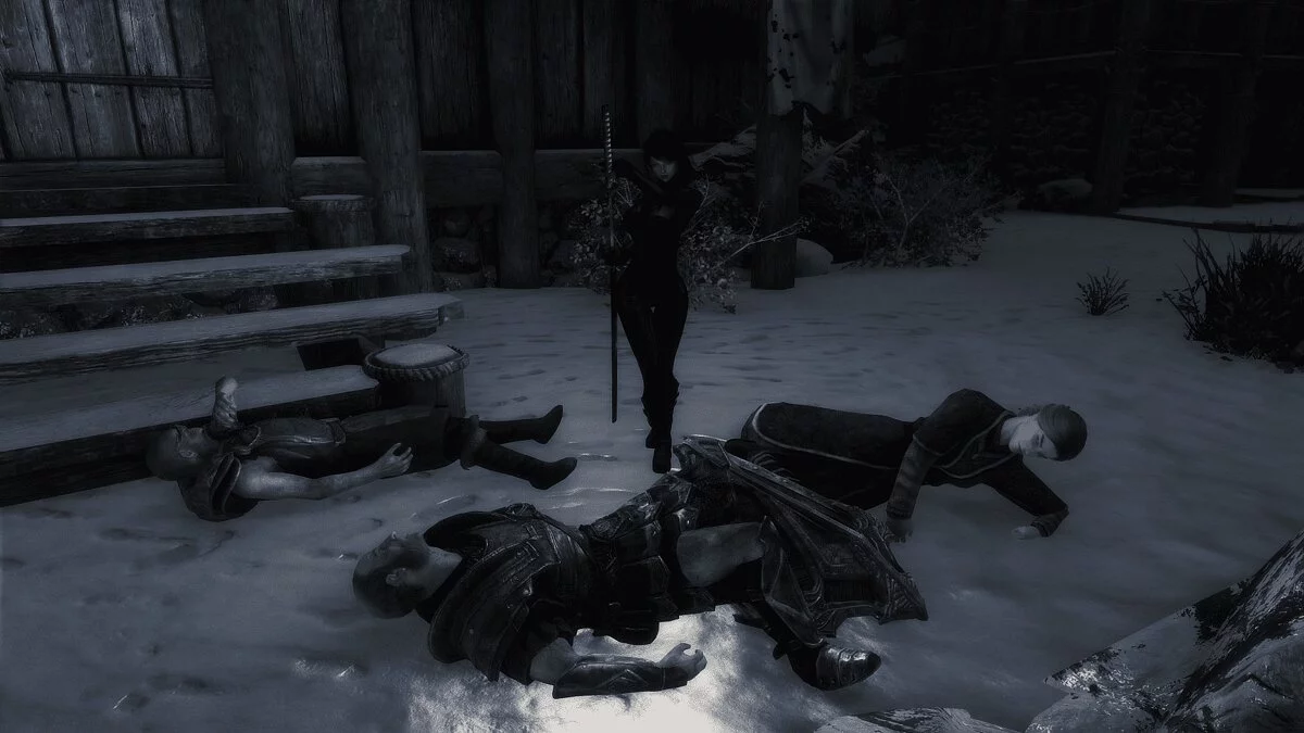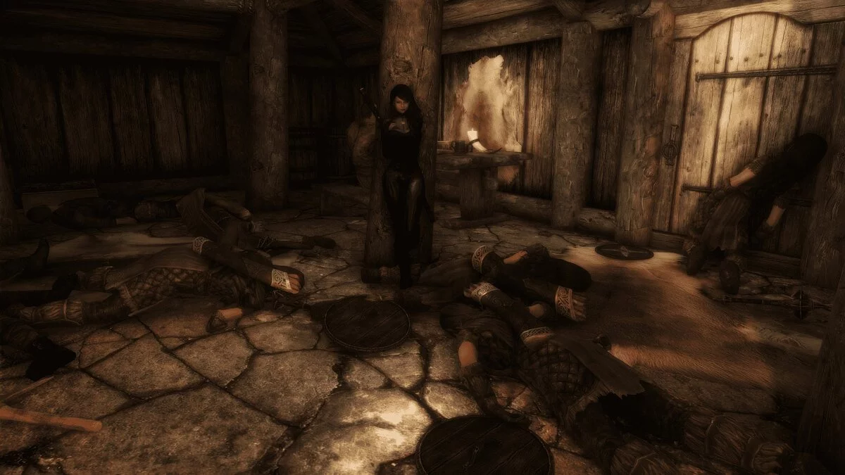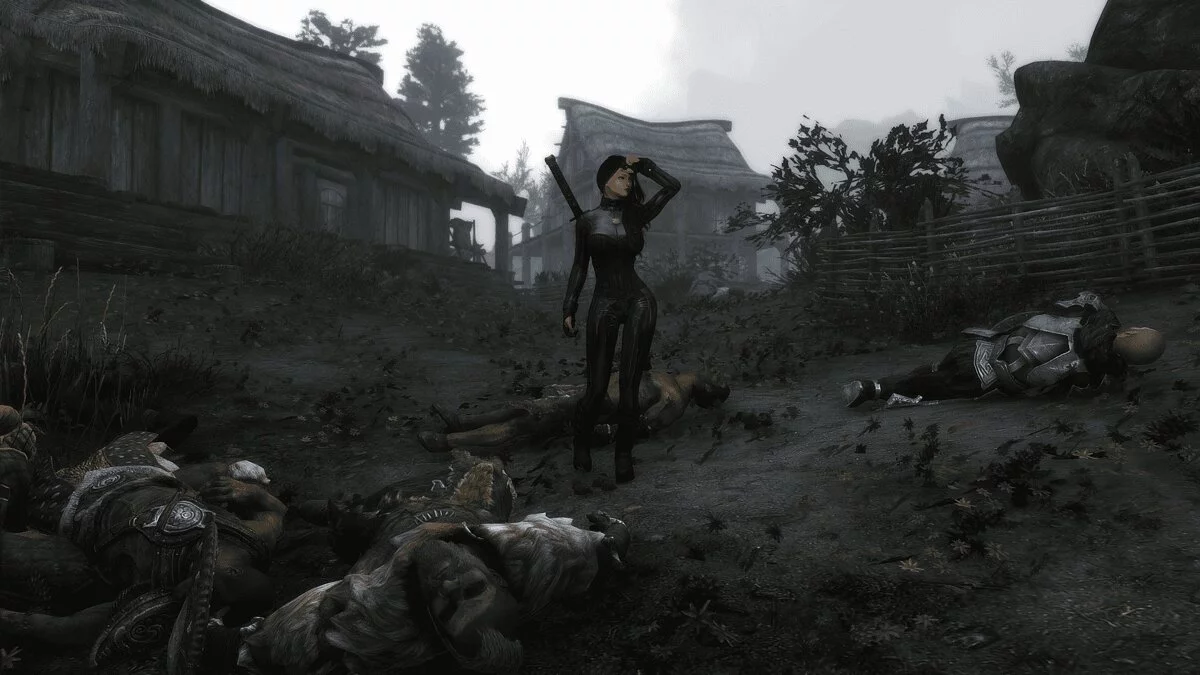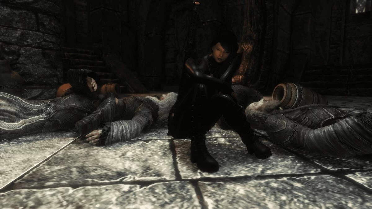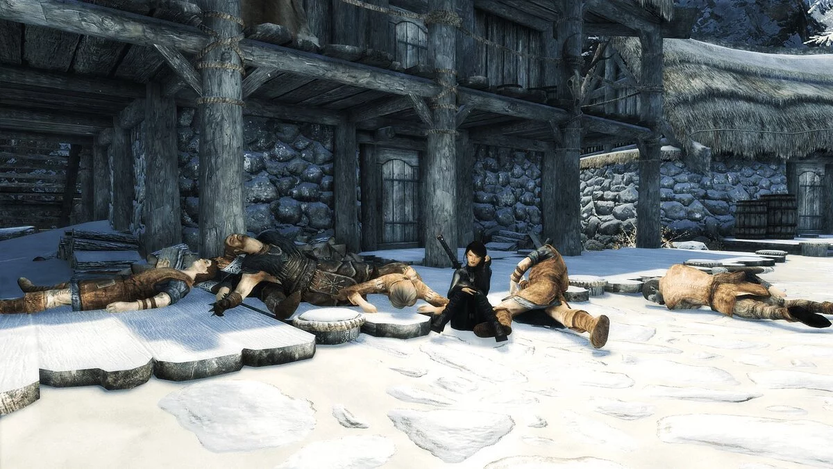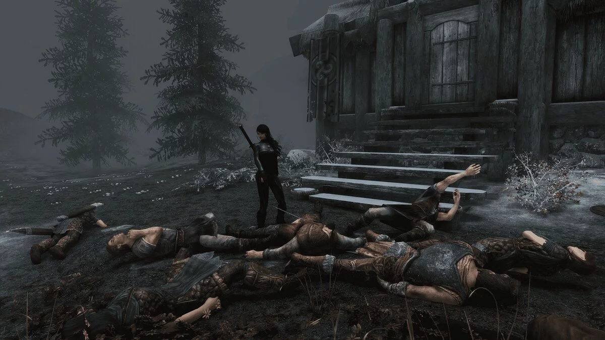 В доказательство автор опубликовал несколько скриншотов, на которых можно увидеть разбросанные по миру трупы и позирующую на их фоне девушку. К слову, это и есть персонаж jaeinskyrim в облике его жены. Если вы впечатлительный и всегда переживали за судьбу жителей Скайрима, лучше не смотрите кадры, опубликованные ниже.
