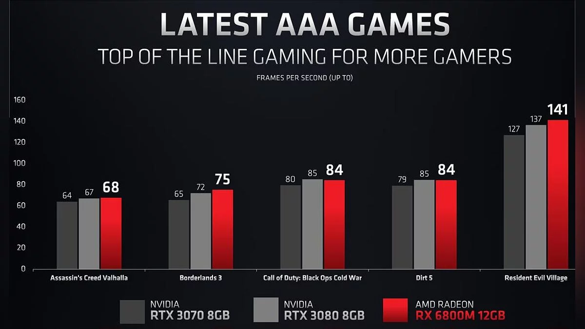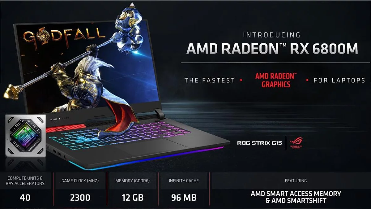 Что касается Radeon RX 6800M — это топовое решение в новой мобильной линейке мобильных видеокарт AMD. Новинка несет на борту 12 гигабайт видеопамяти GDDR6 и 40 вычислительных блоков. Рабочая частота достигает 2300 МГц. По заявлениям AMD, ROG STRIX G15 с графикой от AMD в 1,4 раза быстрее в Assassin's Creed Valhalla и Cyberpunk 2077, чем ноутбук 2019 года с графикой RTX 2070. Также решение от AMD быстрее прямых конкурентов в лице мобильных RTX 3070 и RTX 3080 в Borderlands 3, Resident Evil Village и других играх.