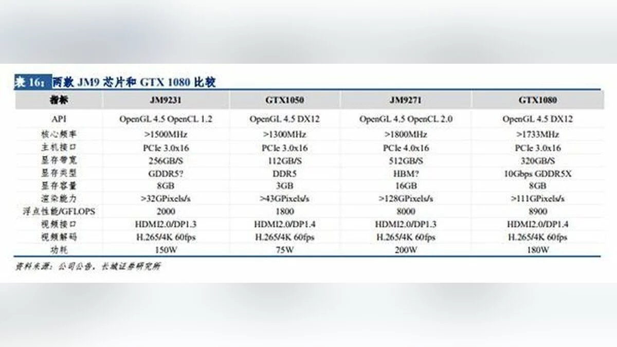 Как ожидается, потребление старшей модели составит примерно 200 Вт. Для JM9271 производительность составит 8 TFLOPS. У 1080 — около 9 TFLOPS. У этой карты обещают частоту графического чипа в 1800 МГц, до 16 ГБ памяти HBM и интерфейс PCIe 4.0. Заявлена поддержка HDMI 2.0 и DisplayPort 1.3.