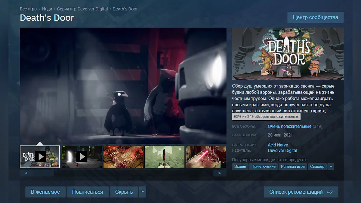Вчера (20 июля) состоялся релиз необычного приключенческого RPG-экшена Death's Door, повествующего о вороне, работающей в отделе смерти. Всего за день игра стала хитом в Steam и получила сотни положительных отзывов. На момент написания новости, ее рейтинг составляет 93%.