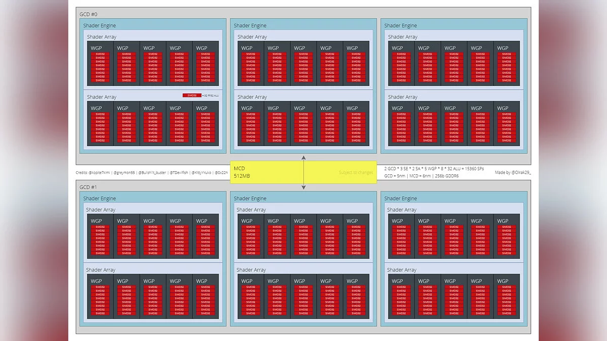 Во-первых, новинке приписывают сразу два графических процессора на одной подложке MCD (Multi-Cache Die) в рамках линейки Navi 31. Это даст 15 360 потоковых ядер, что втрое выше, чем у актуальных моделей. Для сравнения, у Navi 21 на RDNA 2 их всего 5120.