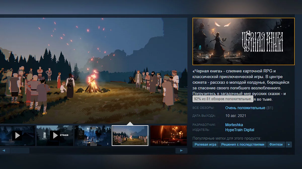 Российская студия Morteshka выпустила игру в сеттинге «русских сказок» под названием Black Book («Черная Книга»). В Steam, на момент написания новости, у нее 92% положительных отзывов.