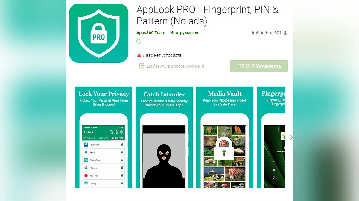 - AppLock PRO — Fingerprint, PIN & Pattern (No ads) — программа, которая позволяет заблокировать доступ к тем или иным приложениям, и установить пароль (загрузить бесплатно);