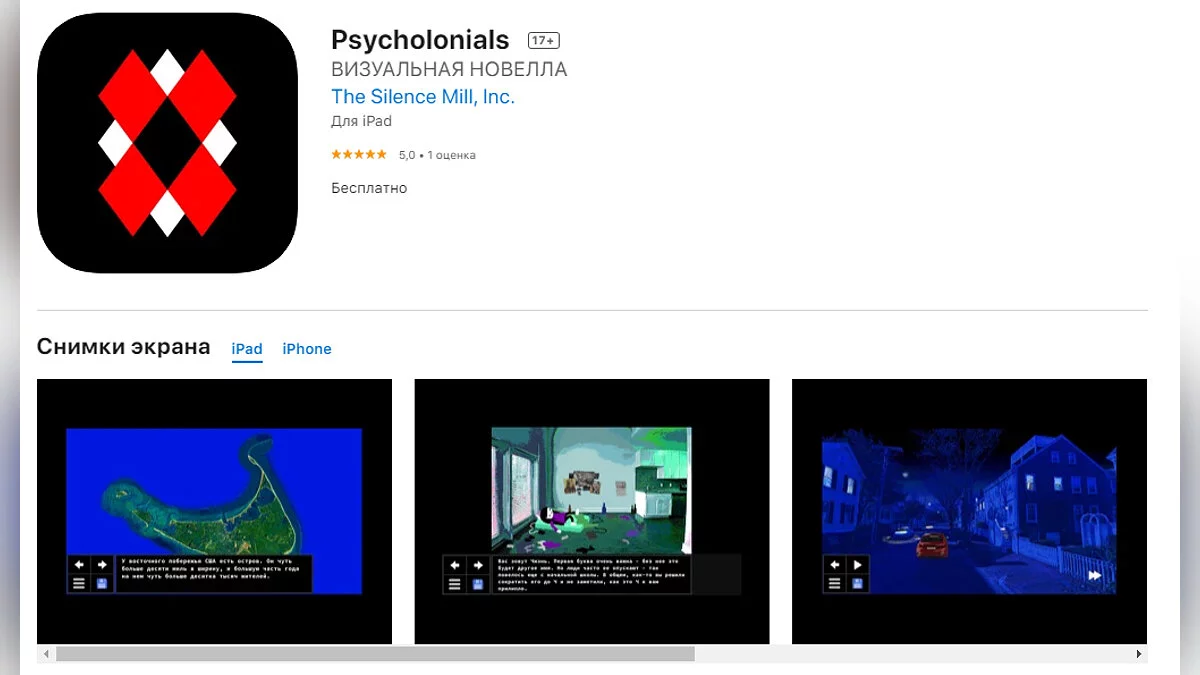 - Psycholonials — визуальная новелла про двух девушек, запустивших в соцсетях «смелый» бренд, в результате чего у них начинаются проблемы с законом (загрузить бесплатно);