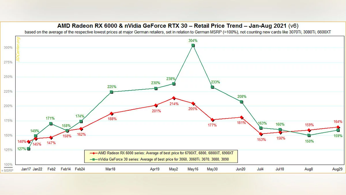 Отметим, что в мае цены на графические процессоры резко снизились, что вызвало энтузиазм и надежду среди геймеров, которые изо всех сил пытались найти видеокарты по разумной цене. Позднее дефицит игровых ускорителей уменьшился, хотя цены всё ещё не вернулись к уровню рекомендуемых.
