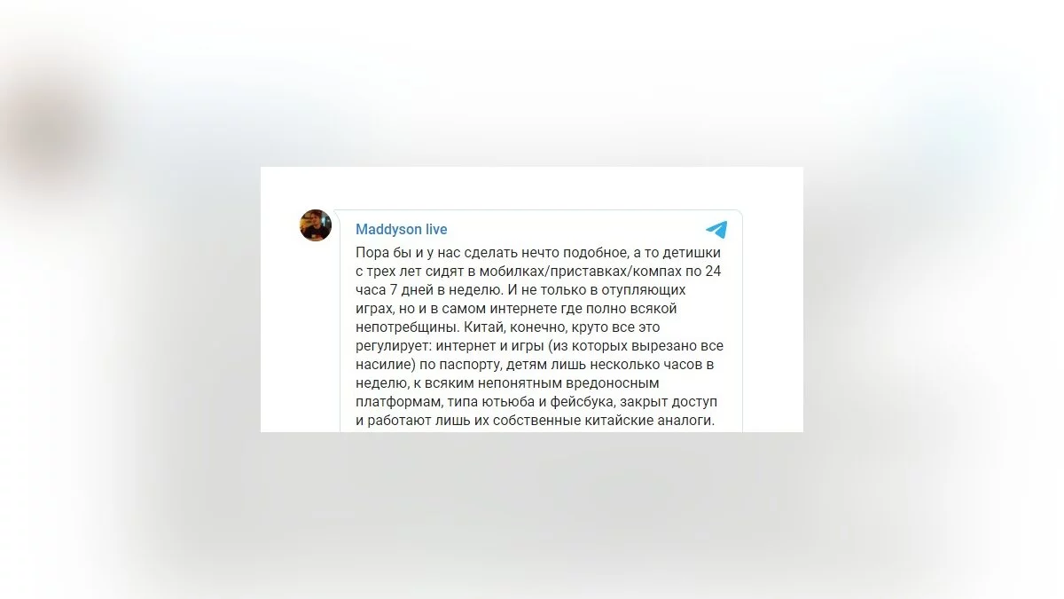 На днях стало известно, что в Китае вводятся жёсткие меры для регулирования игрового рынка. Теперь для детей там будут ограничивать время, проведённое в играх. Известный стример Илья Мэддисон предложил скопировать этот опыт для России.