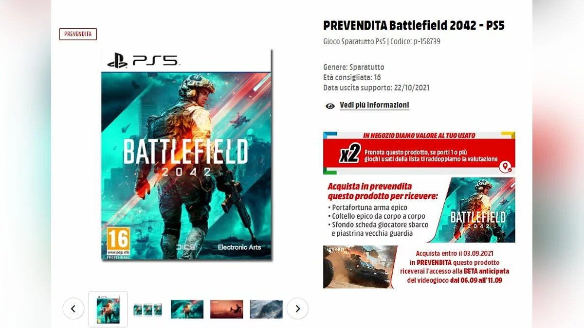 На сайте крупной итальянской сети магазинов MediaWorld был замечен рекламный баннер шутера Battlefield 2042 с датой проведения грядущего бета-теста. Если верить утечке, тестирование пройдёт с 6 по 11 сентября. В нём смогут принять участие все, кто оформил предзаказ.