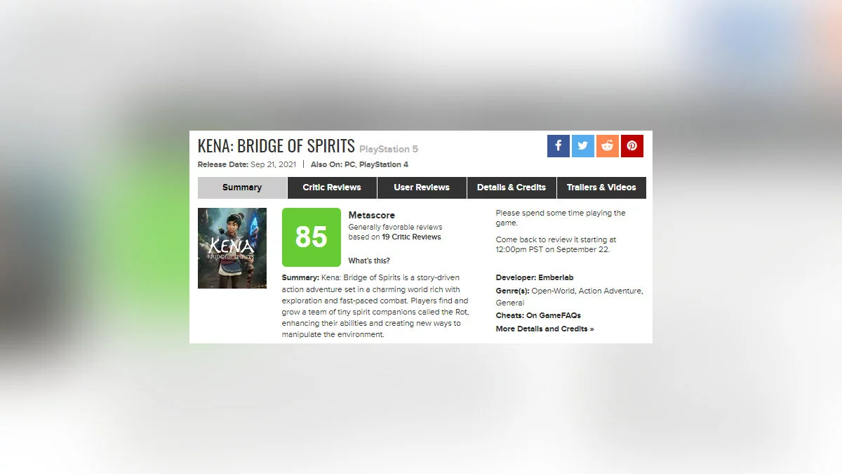 На момент написания новости, у Kena: Bridge of Spirits (PS5-версии) 85 баллов на Metacritic. Для сравнения, оценка Resident Evil Village (PS5-версии) составляет 84 балла, а Little Nightmares 2 (PC-версии) — 83 балла. Не исключено, что после публикации дополнительных рецензий средний балл Kena: Bridge of Spirits может немного измениться.