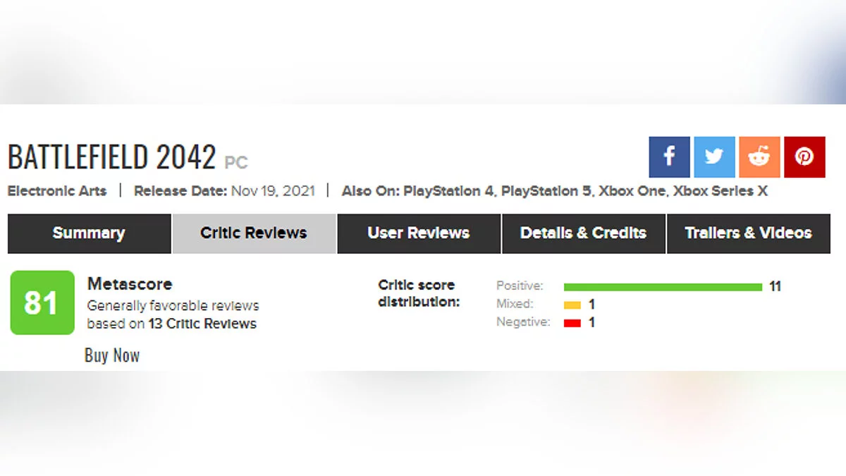 За неделю до официального релиза военного шутера Battlefield 2042 на сайте Metacritic начали появляться первые обзоры игры от профильных изданий.