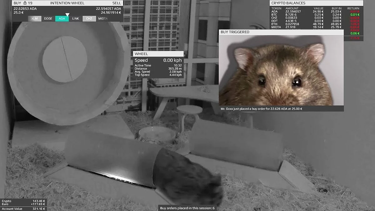 Идея состояла в том, что хомяк выбирал определённую криптовалюту, а затем проходил через один из так называемых коридоров «принятия решений», чтобы купить или продать её.