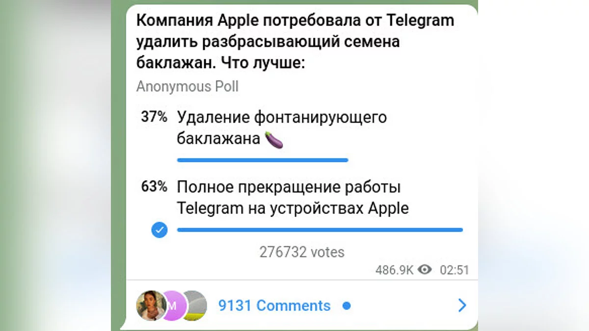 Помимо этого, Дуров устроил шуточный опрос на тему «Что лучше». Причём большинство пользователей выбрали вариант «полное прекращение работы Telegram на устройствах Apple».
