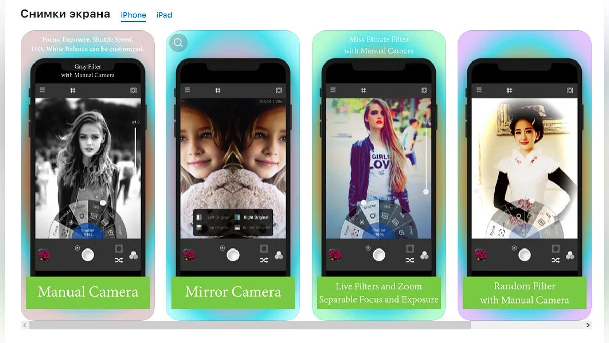 - Camera X _ Manual adjustments — довольно мощная программа для фотосъёмки с разными фильтрами (загрузить бесплатно).
