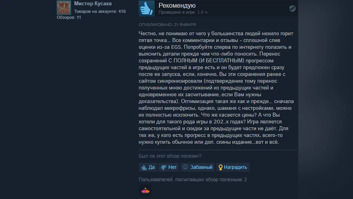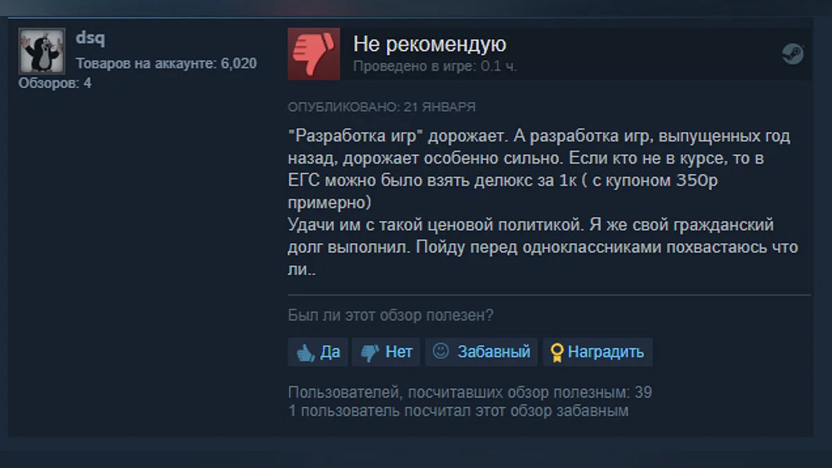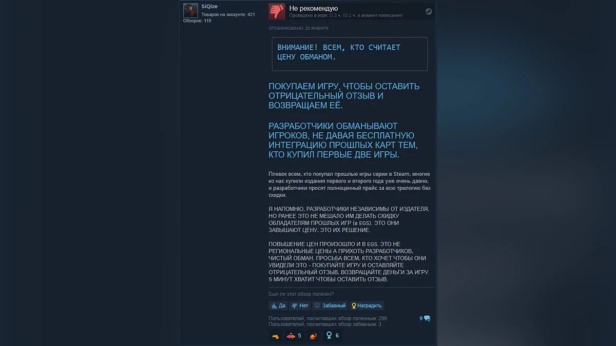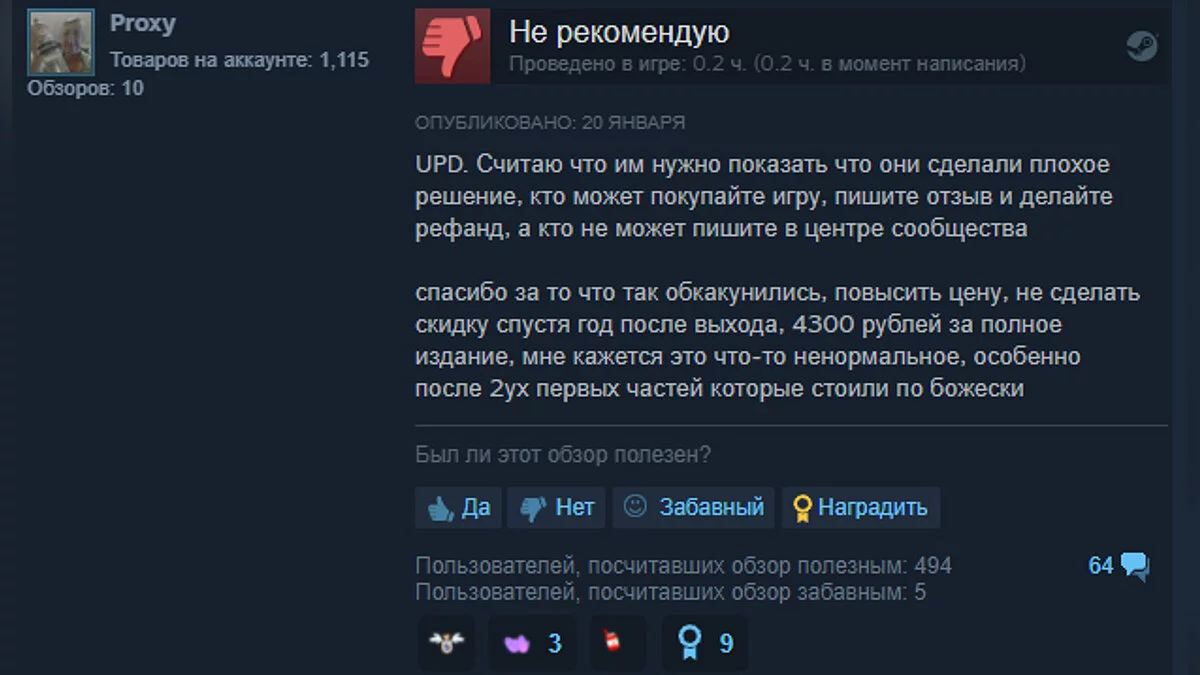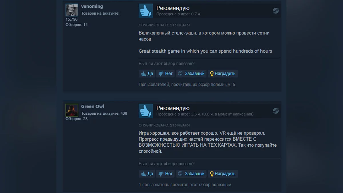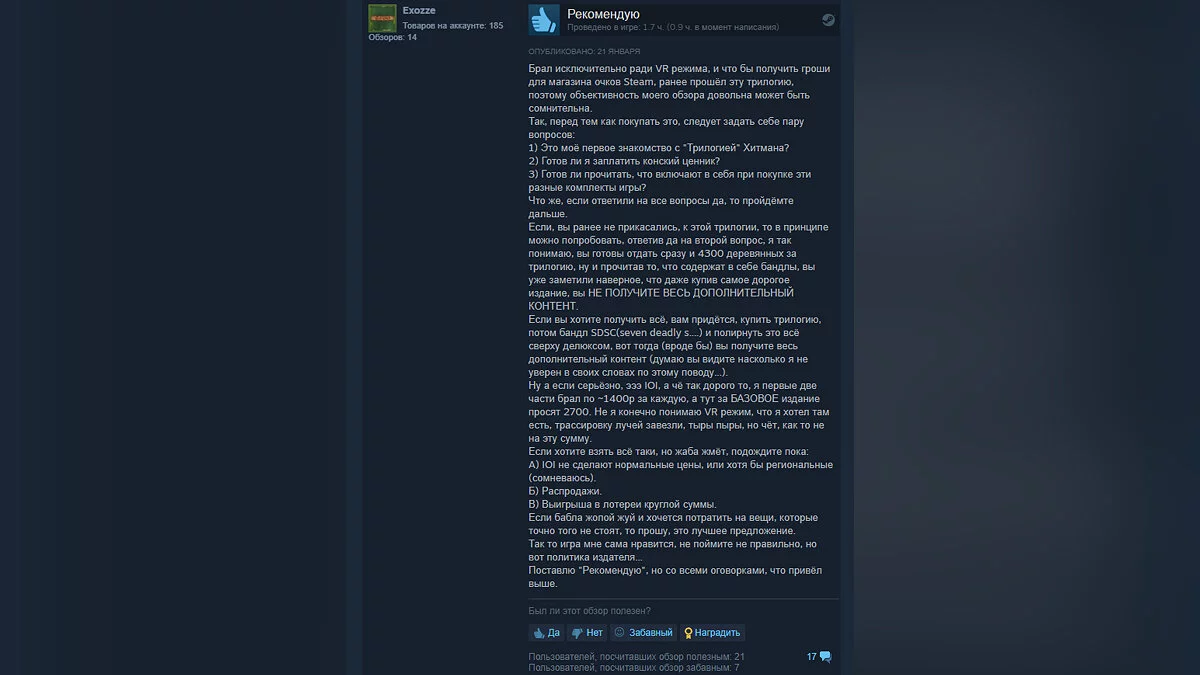 Большинство геймеров критикуют игру и разработчиков за повышение цены. До релиза в Steam PC-версия Hitman 3 продавалась за 1549 рублей. Сейчас стоимость игры выросла до 2698 рублей (в Steam и EGS). А еще некоторые игроки раскритиковали VR-режим.