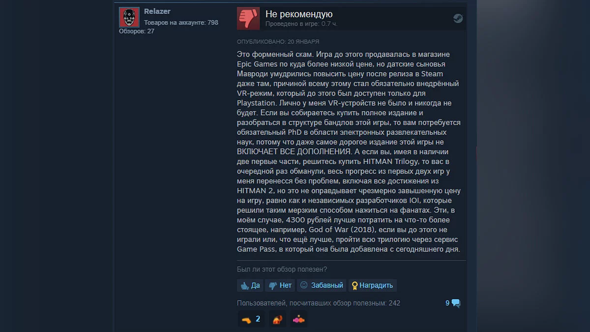 На момент написания новости рейтинг Hitman 3 в Steam составляет 42% на основе 340 отзывов.
