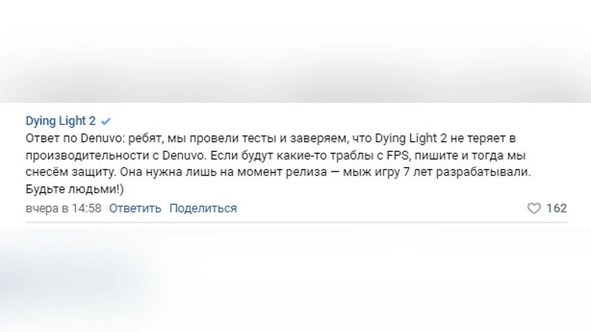 Вчера стало известно, что Dying Light 2 получит защиту Denuvo — на это указывает плашка в Steam. Это сразу же вызвало негативную реакцию многих игроков.