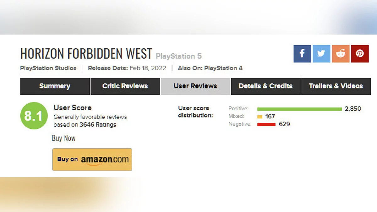 19 февраля, спустя день после выхода Horizon Forbidden West, на Metacritic спал запрет на публикацию пользовательских обзоров. Сразу после этого игра «утонула» в негативных обзорах.