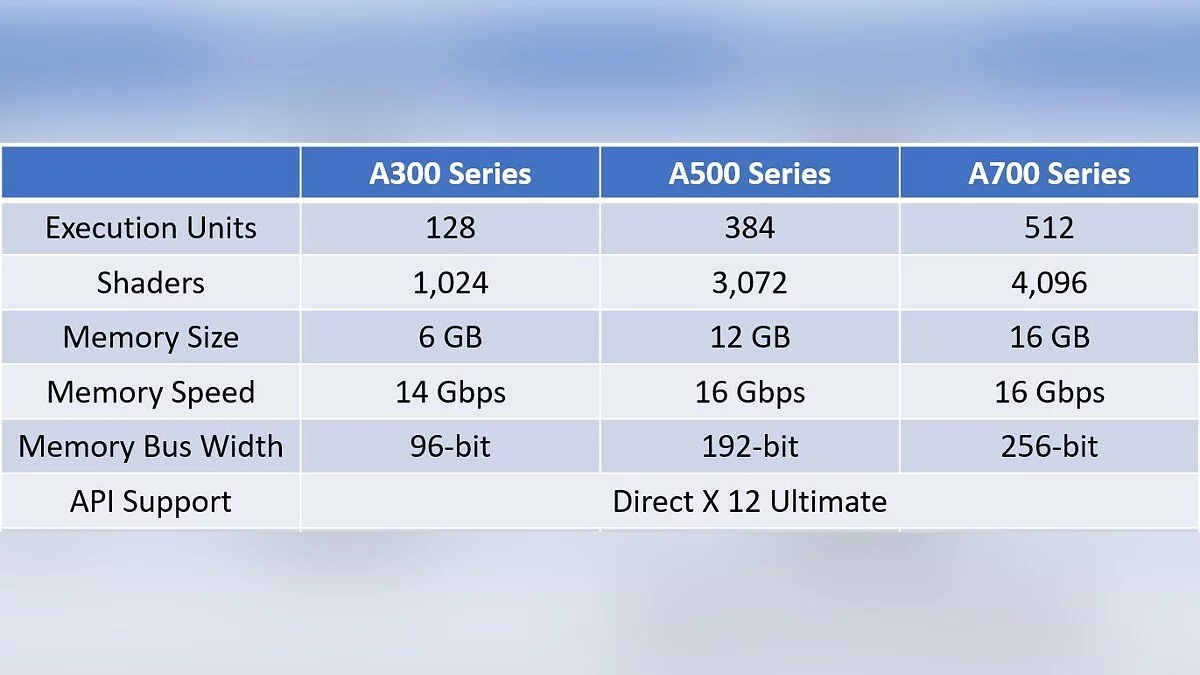Итак, ожидается, что буде три семейства: A300, A500 и A700. Младшая модель получит графический чип DG2-128 со 128 исполнительными блоками. Средняя и старшая получат DG2-512 с 384 и 512 блоками. Объёмы памяти составят 6 ГБ (A300), 12 ГБ (A500) и 16 ГБ (A700) с частотами 14, 16 и 16 ГГц соответственно. Шины будут на 96, 192 и 256 бит. При этом заявлена поддирка аппаратного ускорения трассировки лучей и irectX 12 Ultimate.