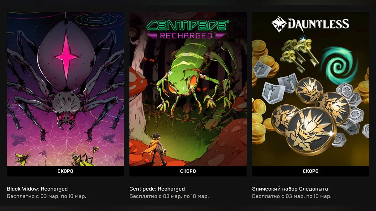 На следующей неделе Epic Games раздаст в EGS твин-стик шутер Black Widow: Recharged, аркаду с отстрелом насекомых Centipede: Recharged и эпический набор следопыта для бесплатной ролевой онлайн-игры Dauntless.
