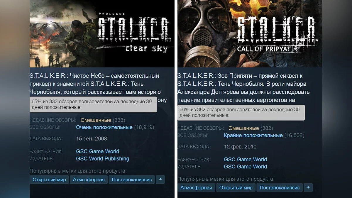 На днях GSC Game World убрала из продажи все свои игры в российском Steam, включая трилогию S.T.A.L.K.E.R. и «Казаков». Геймеры из России оказались возмущены таким поступком студии и начали и занижать рейтинг её проектам. Больше всего досталось S.T.A.L.K.E.R.: Clear Sky и S.T.A.L.K.E.R.: Call of Pripyat.
