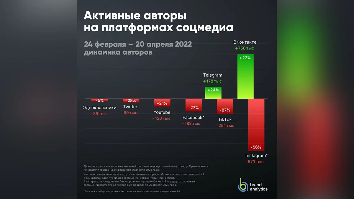 Аналитическая компания Brand Analytics опубликовала свежие данные о социальных сетях и платформах. Они касаются русскоязычных авторов.