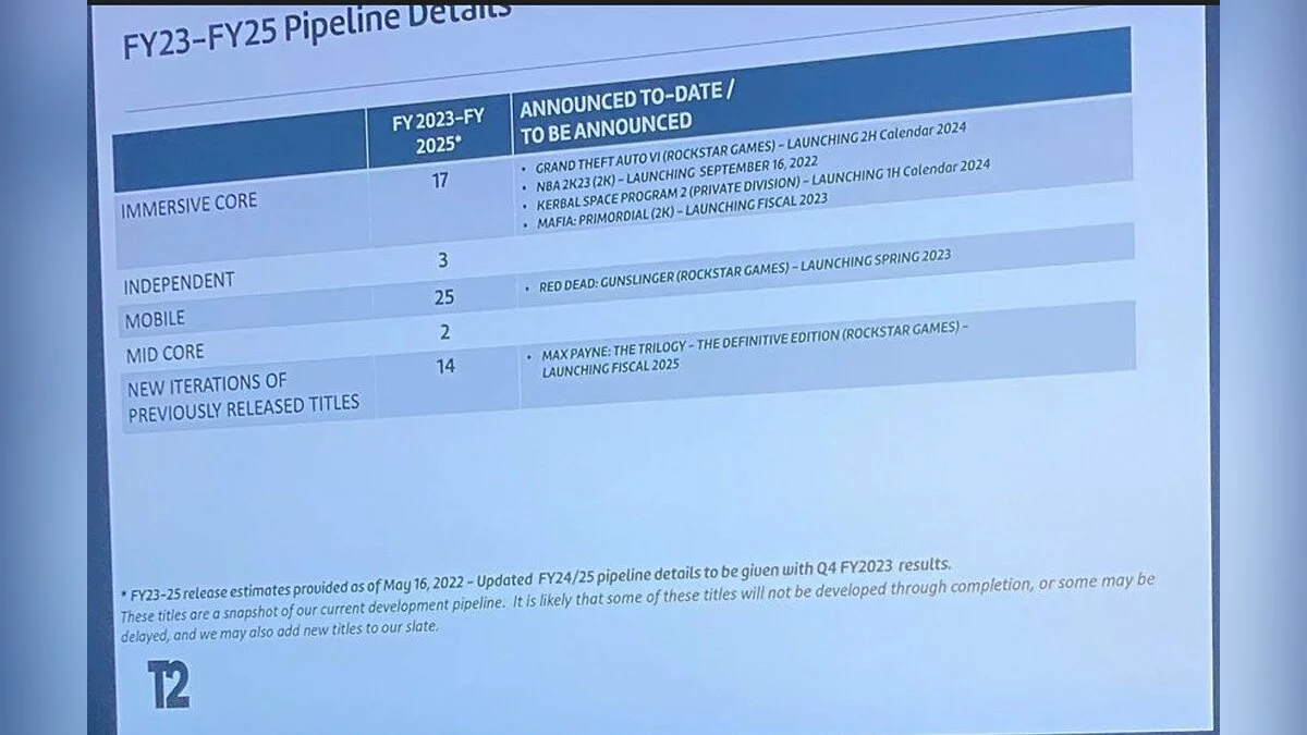 Как сообщается, эту игру могут выпустить во второй половине 2024 года, так что релиза придётся подождать. Помимо этого, свежая утечка упоминает релизы Kerbal Space Program 2 (запуск в первой половине 2024 года), Mafia: Primordial (запуск в 2023 финансовом году), NBA 2K23 (выход 16 сентября текущего года), Red Dead: Gunslinger (запуск весной 2023 года).