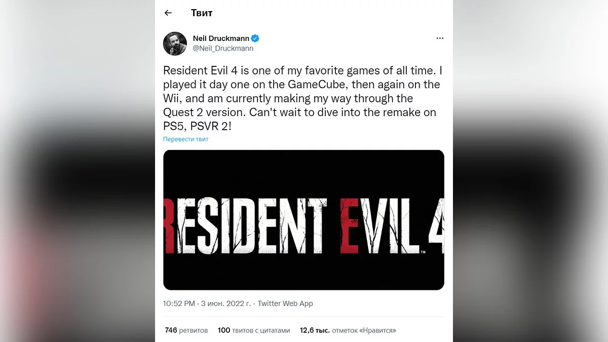Нил Дракманн (Neil Druckmann), творческий директор и со-президент Naughty Dog, известный по сериями Uncharted и The Last of Us, прокомментировал в Twitter анонс ремейка культовой Resident Evil 4. В своём сообщении известный разработчик заявил, что не может дождаться, чтобы погрузиться в ремейк, поскольку оригинал является одной из его любимых игр всех времен.