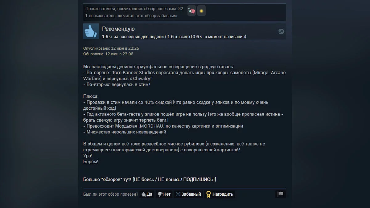 На момент написания заметки экшен имеет очень положительные отзывы на основе 690 обзоров. Больше всего рады фанаты оригинальной Chivalry, которые наконец смогли запустить игру на любимой платформе.