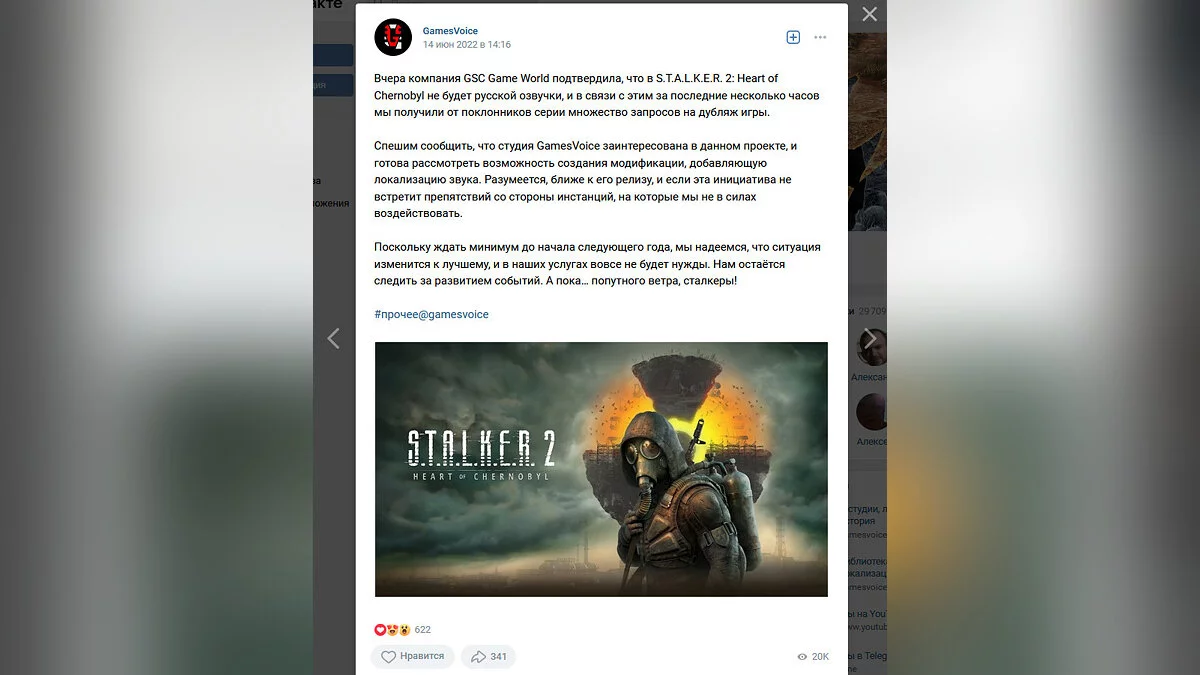 На днях стало известно, что S.T.A.L.K.E.R. 2 не получит русской озвучки. Об этом в GSC Game World заявили официально. Но теперь независимая студия GamesVoice пообещала выпустить свою версию озвучки.