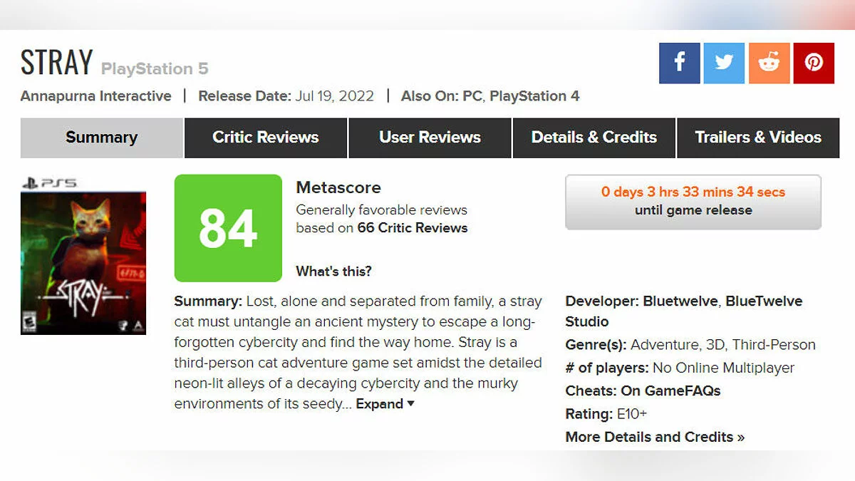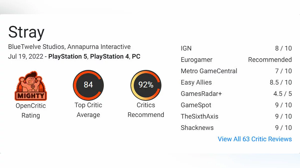 За день до релиза появились оценки киберпанк-адвенчуры про рыжего котика Stray. Если кратко, то игра получилась милой и увлекательной. Средний балл проекта на Metacritic и OpenCritic составляет 84/100.