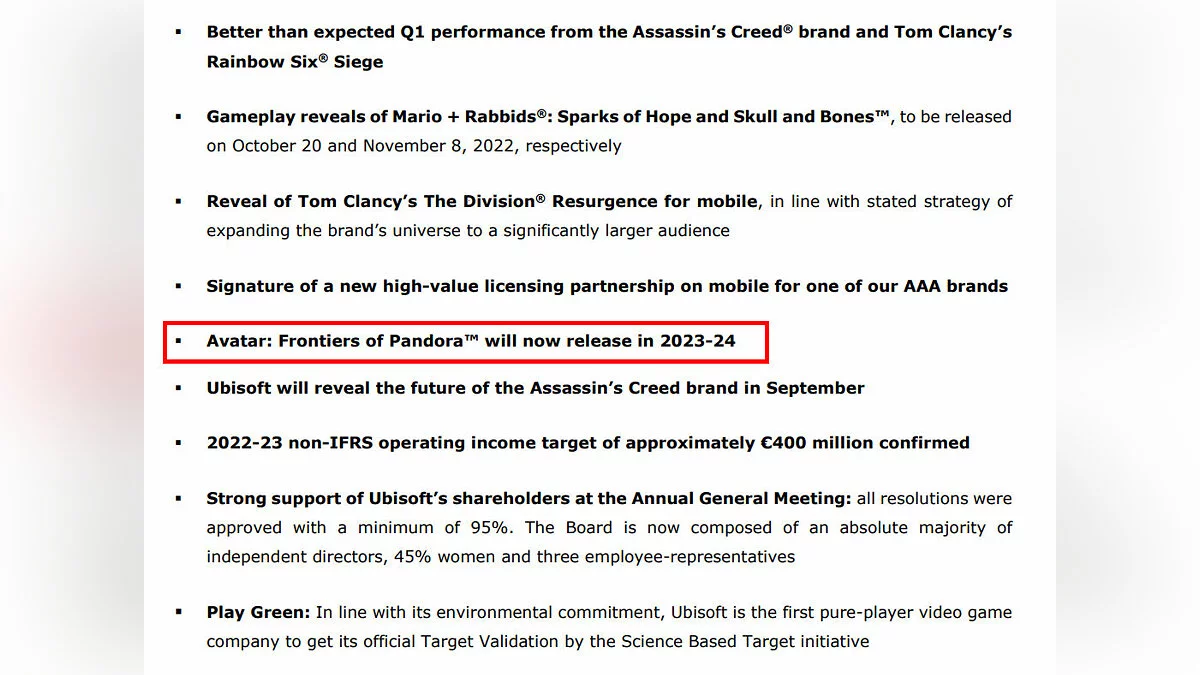 Компания Ubisoft сообщила о переносе своей ААА-игры по «Аватару» Avatar: Frontiers of Pandora. Теперь проект выйдет с 1 апреля 2023 года по 31 марта 2024 года. Изначально его планировали выпустить до конца 2022 года.