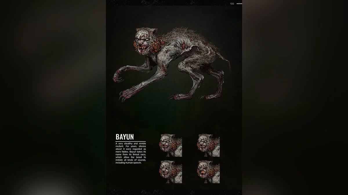 В описании говорится, что Баюн может издавать любые звуки, в том числе имитировать человеческую речь, стрельбу и другие звуки. Он очень проворный и скрытный, обладает развитым интеллектом. Об этом монстре в Зоне ходят легенды.